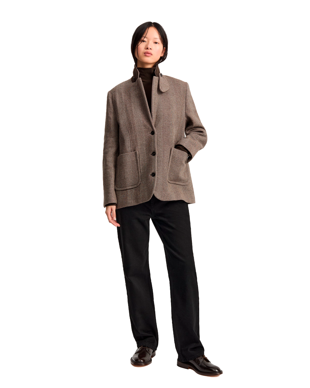 Fremstillet i blød, genanvendt uld i en kraftig herringbone-struktur.