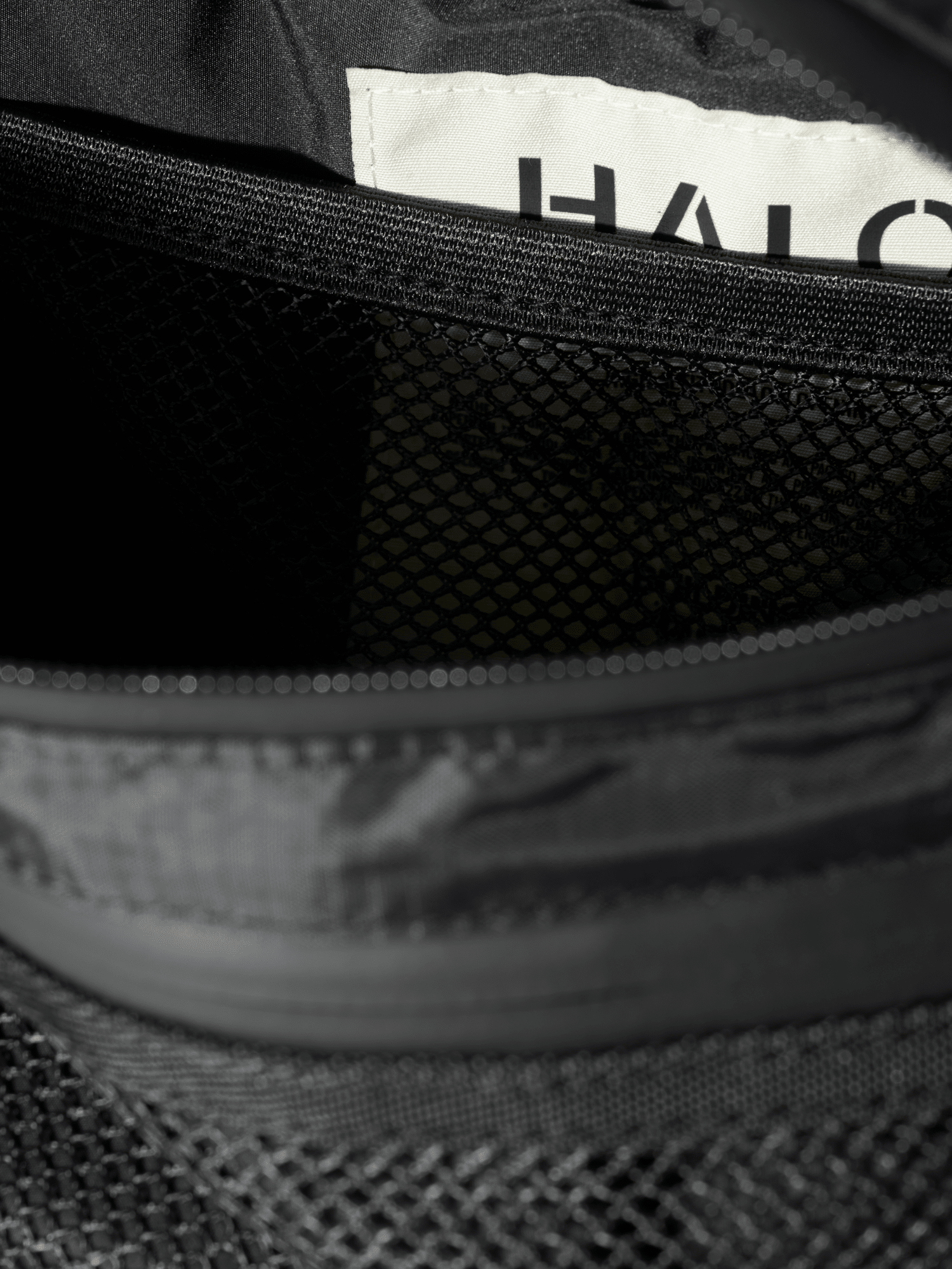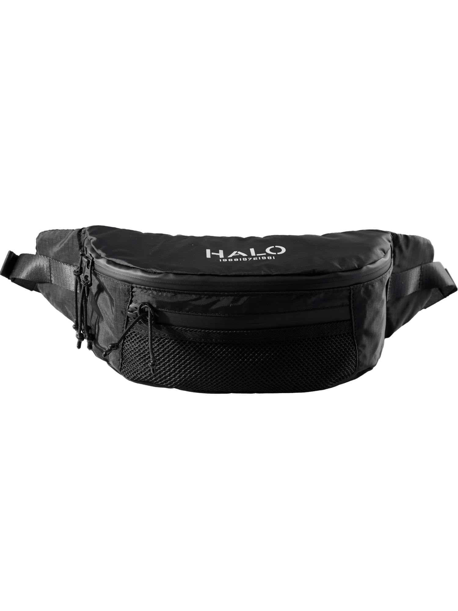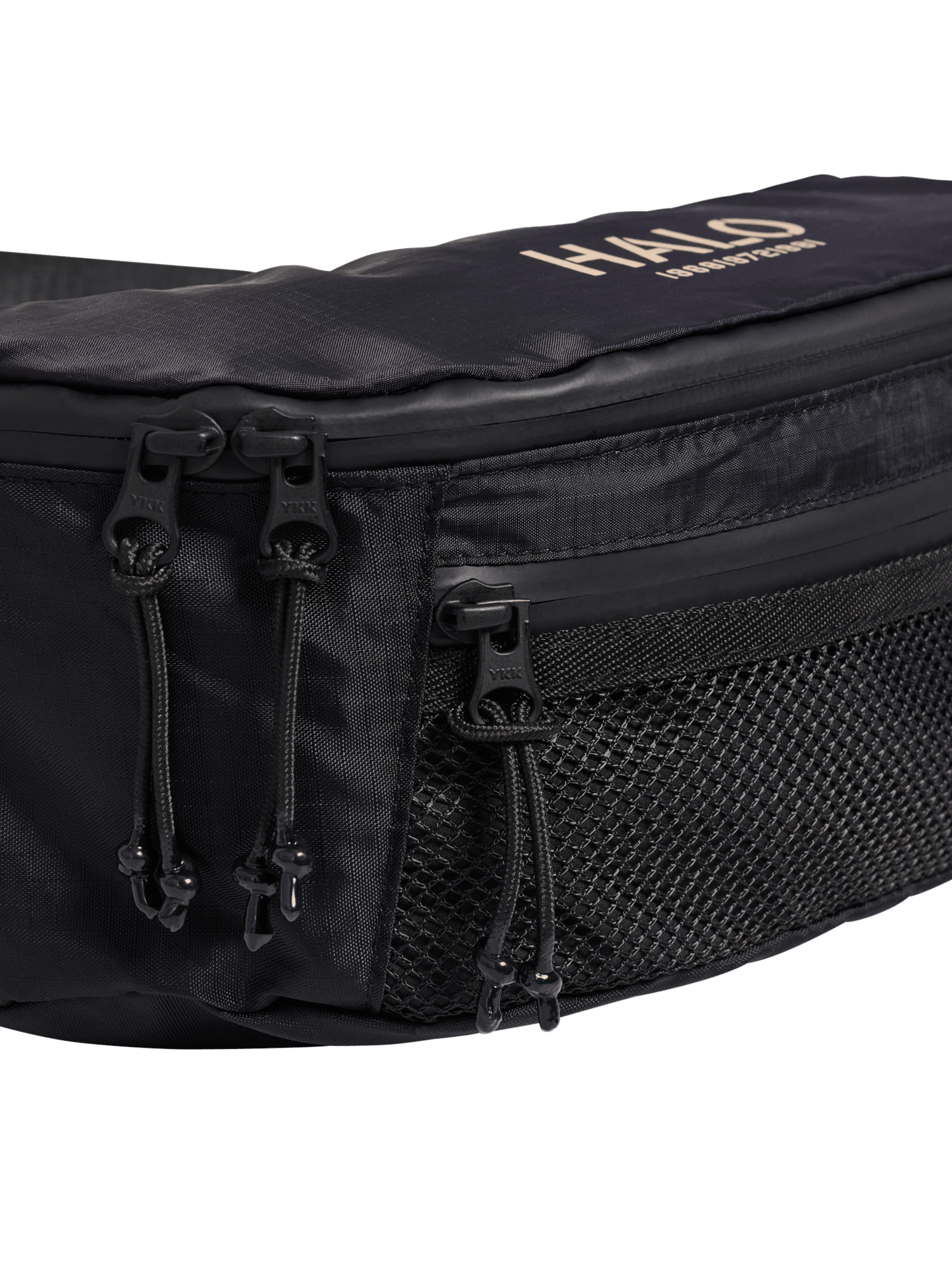 Taske lavet af nylon med printet HALO logo på. 2 lommer som lukkes med vandtætte lynlåse.